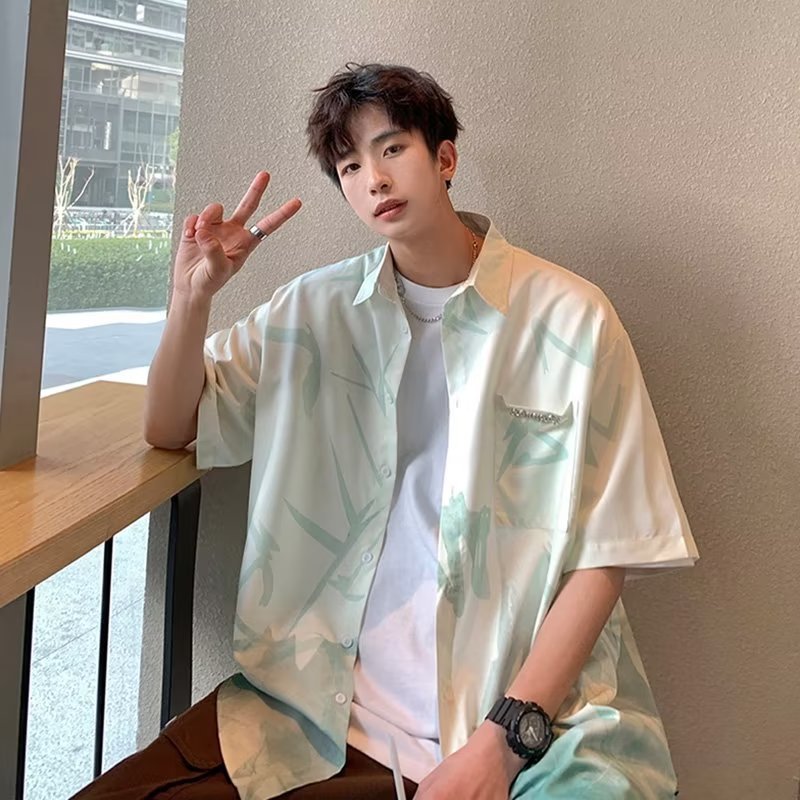 Men Shirts Summer Versatile Ink Painting Ice Silk Cool Feeling
