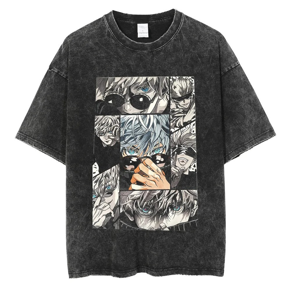 Japanese Anime Print T-shirt Men Oversized Vintage Washed Black